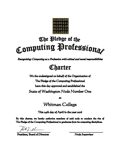 Last Wednesday we celebrated the third annual Pledge of the Computing Professional at Whitman College, with our first two computer science majors, three computer science minors, and an independent major.