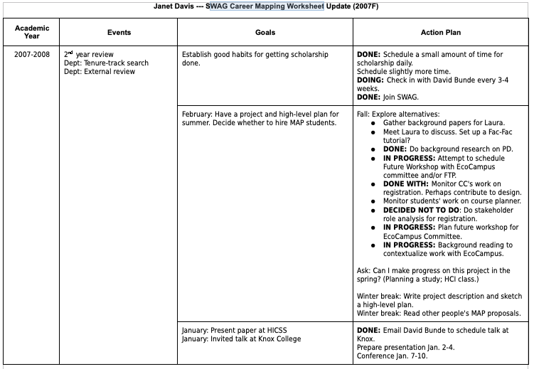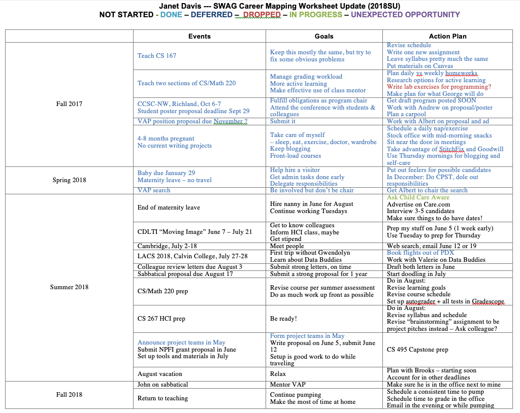 - There’s some chance I might look at it and even update it more often than once a quarter. (I always printed out my SWAG plan. In a good semester, I updated it with a pencil as I got things done. In a bad semester, it was ignored until the next SWAG meeting.)