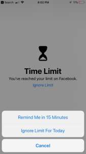 So, now I have a 20 minute limit on using Facebook. But, Screen Time makes it super easy to ignore time limits, providing options to “Remind Me in 15 Minutes” or “Ignore Limit for Today.”